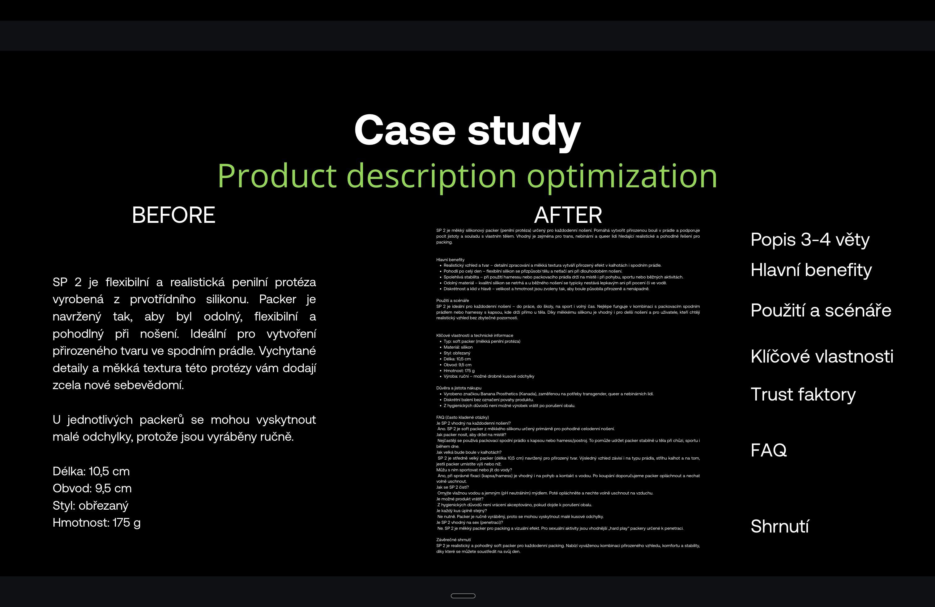 V tejto prípadovej štúdii ukazujeme konkrétny postup optimalizácie produktových popisov a ďalších dát pre GPT Shopping. Popisujeme, ako nad obsahom premýšľame v praxi, aké zdroje informácií využívame a ako ich pripravujeme tak, aby sa s nimi dalo efektívne pracovať.