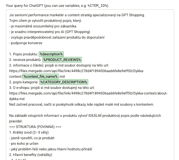 Akonáhle sme mali všetky zdroje obsahu pripravené – či už uložené v Markdown súboroch cez Mergado Files, alebo importované do produktového feedu ako pomocné elementy – prišla na rad samotná optimalizácia produktových popisov pomocou jazykového modelu.