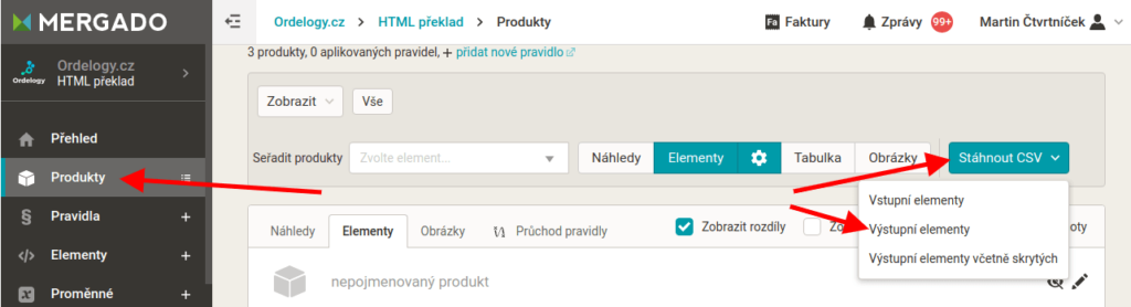 - Ak už máte preložený feed vytvorený ako export v MERGADE, stačí na stránke Produkty v MERGADE kliknúť na Stiahnuť CSV a vybrať Výstupné elementy.
