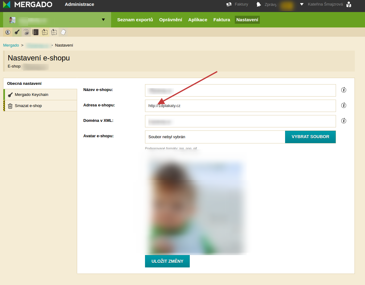 Ďalšiu úpravu vykonajte v Nastavení e‑shopu, kde zmeňte adresu e‑shopu. Táto úprava nie je nutná, pretože adresa slúži len pre interné potreby Mergada, môže sa ale hodiť mať ju v poriadku.