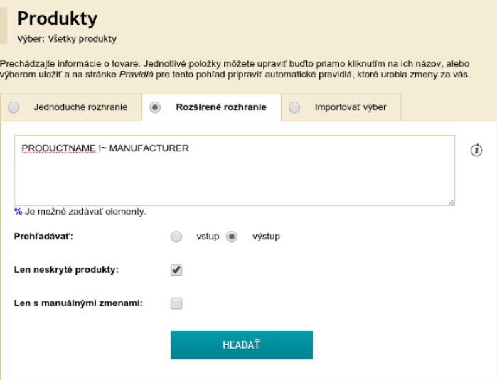Týmto výberom zistíte produkty, ktorých názov neobsahuje výrobcu. Prečo sa to hodí? Väčšina porovnávarčov vyžaduje, aby v názve produktu bol obsiahnutý aj výrobca a týmto výberom jednoducho zistíte, u ktorých produktov to tak nie je.